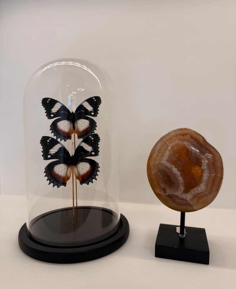 Met zorg gepresenteerd in een stijlvolle glazen stolp, waardoor dit natuurproduct een tijdloze en luxe uitstraling krijgt.