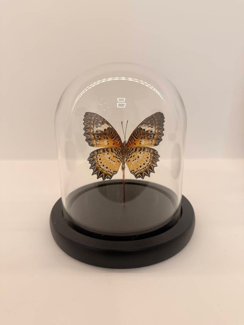 De vlinder is zorgvuldig gepresenteerd in een luxe glazen stolp, waardoor hij niet alleen beschermd is, maar ook een stijlvolle uitstraling krijgt. Perfect voor een dressoir, bureau of vitrinekast en ideaal als uniek cadeau voor natuurliefhebbers en interieurfans.