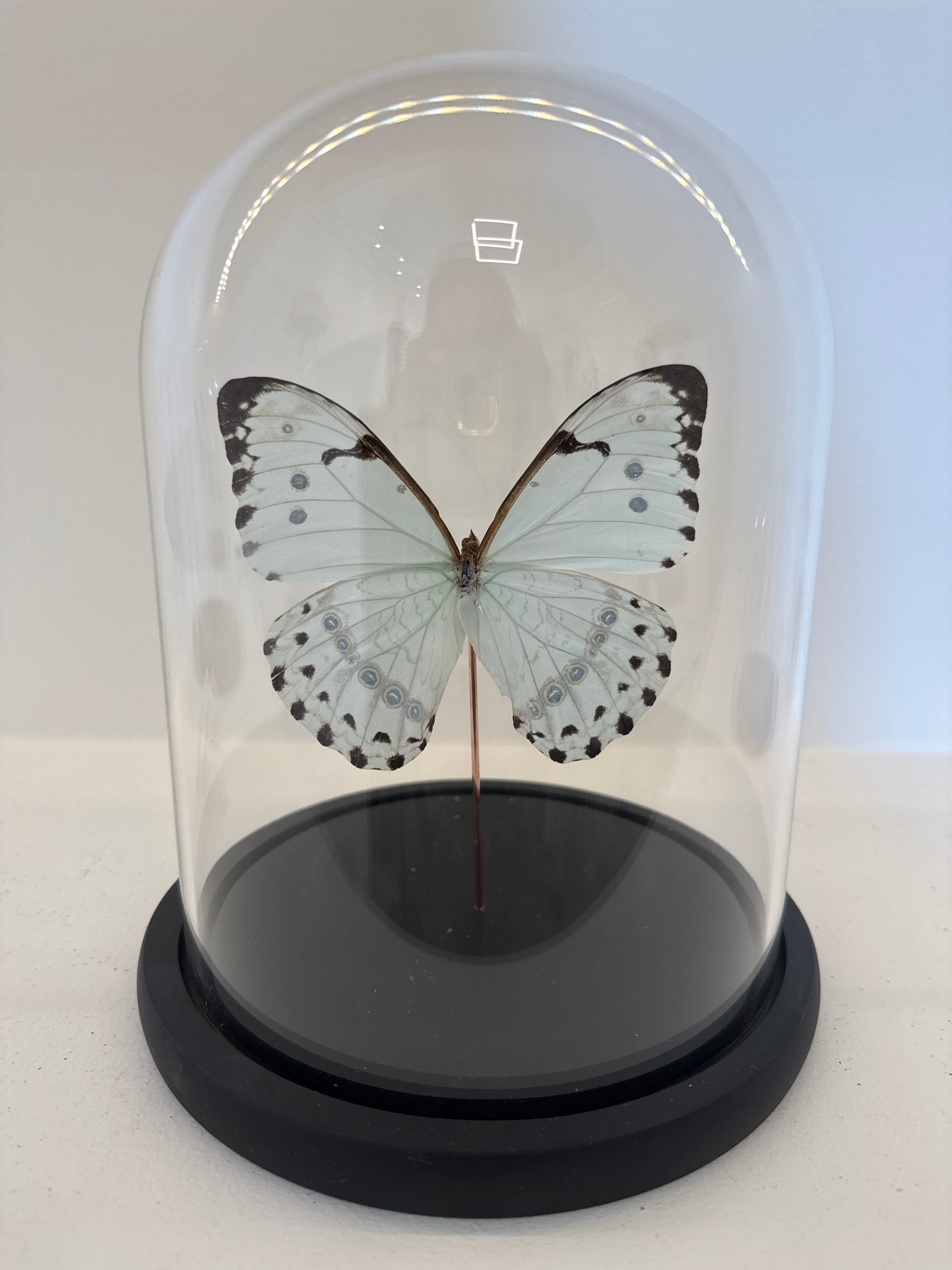 Twee elegante witte Morphos uit Midden-Amerika, symbool voor puurheid en verfijning. Hun parelmoer witte vleugels met subtiele oogvlekken en zwarte accenten maken deze stolp tot een waar kunstwerk.